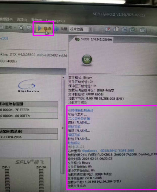 选择自动,此时可以看到烧写的过程:擦除 –> 编程 –> 校验