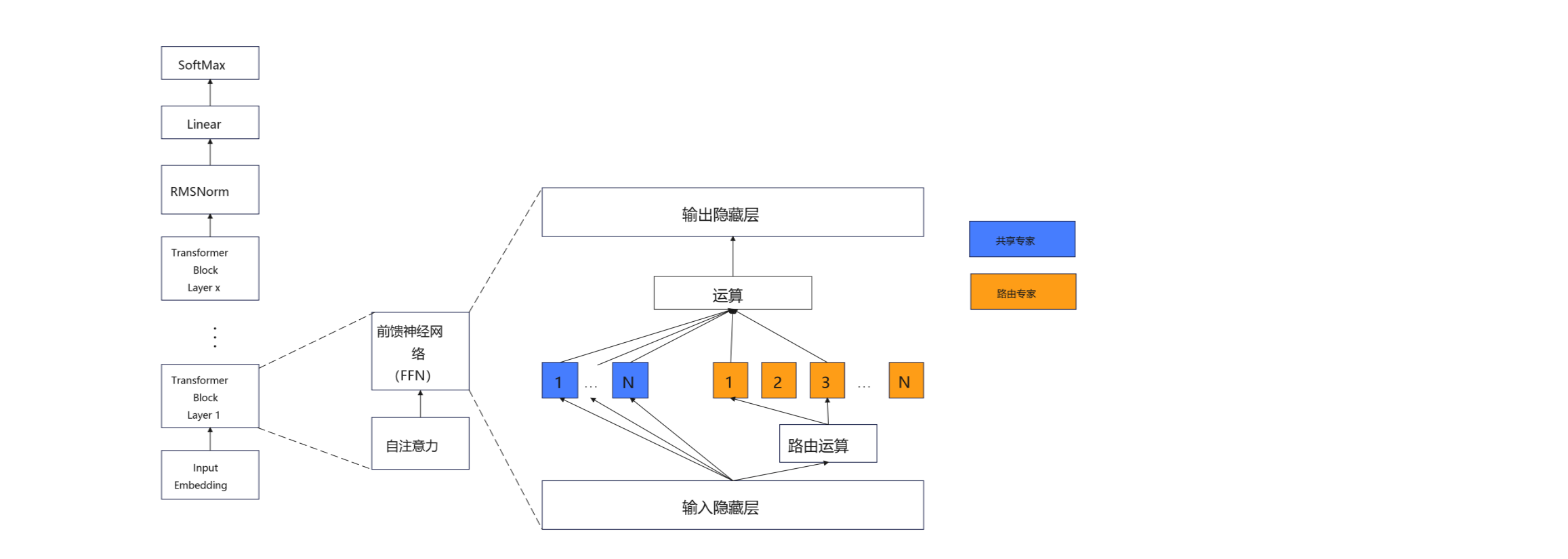 在MoE模型中,前馈网络(FFN)层从一个大的稠密矩阵变成了数百个稠密的小矩阵,每次运算只会激活6~8个小矩阵。